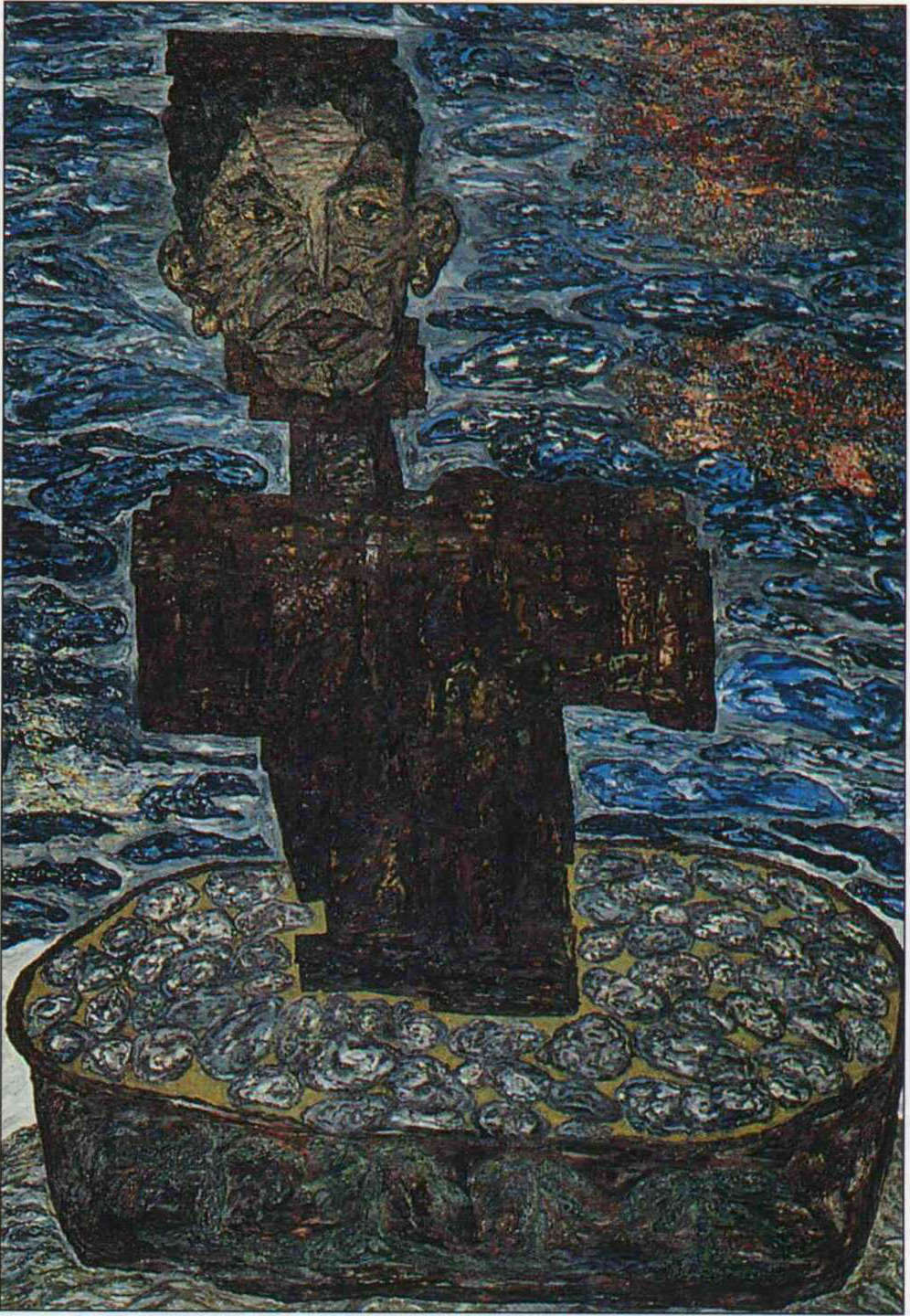 僵硬的身體像磚塊般地被砌成一座十字架;宛如一座悼亡的紀念碑,被鑄立在一座淺淺小小只有黃沙和石塊的花盆中。背後是灰藍黑黯的雲朵,滿滿地擠滿所有的空間。畫家許雨仁將自己畫成一棵盆景。
