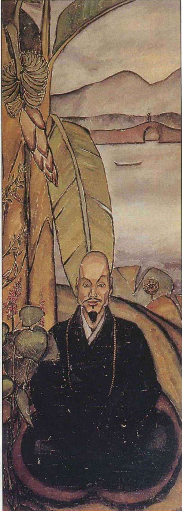 一生在大陸致力美術教育的台籍畫家劉錦堂,在題名〈芭蕉圖〉的自畫像中,以出家人的形象顯現自己,留給後人一個永遠的謎團。1928-29年(中國美術館提供)
