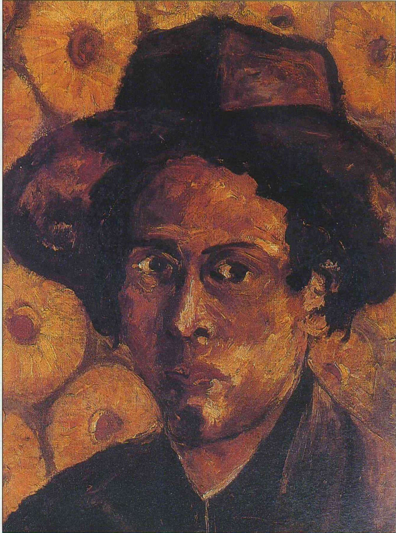 日據時期的畫家陳澄波,生平最景仰荷蘭畫家梵谷;因此他的自畫像即以梵谷聞名於世的畫作〈向日葵〉作為背景。41x32cm,1927年(陳重光提供)