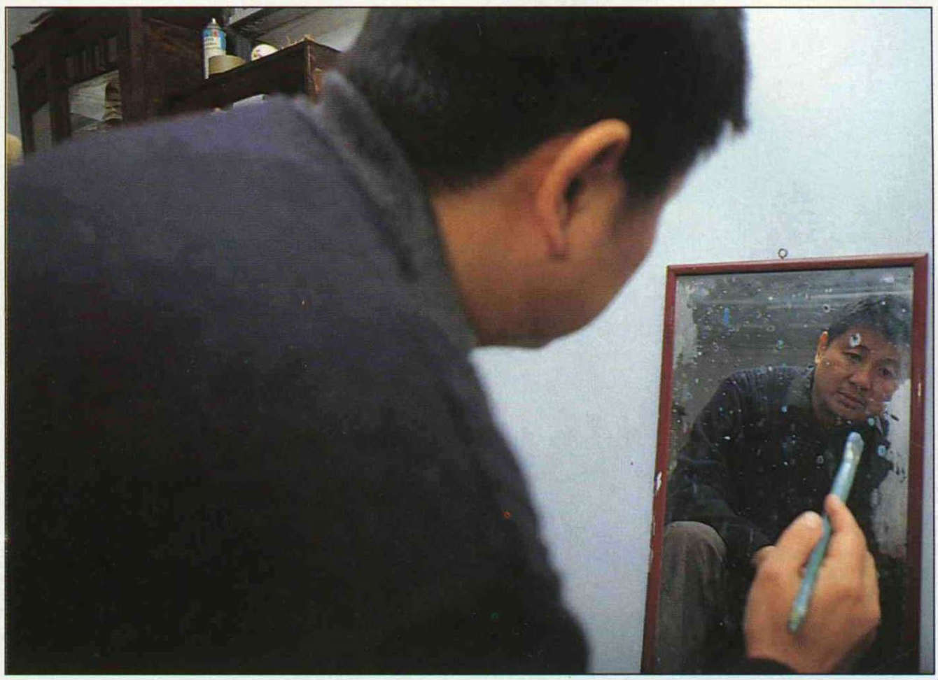 對鏡自畫,畫家鄭在東大多數的創作中,都有自己的身影頭顱出現。藉著對自己的不斷描繪,訴說著自己以及這一代人的故事。(薛繼光)