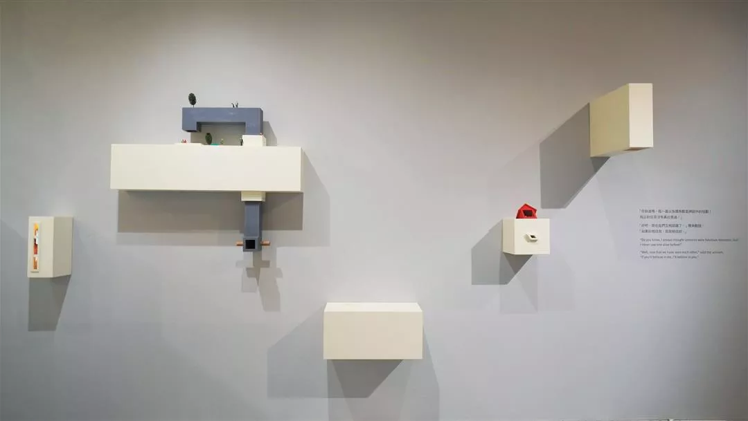 《娃娃屋》2016 觀者必須隨著裝置角度的不同,而改變觀看方式。但《娃娃屋》不同於以往的作品只是攝影影像的再現,而是將真實的玩具擺設進入這些裝置內,讓觀賞者感到熟悉又陌生的氛圍。