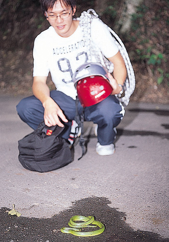 別怕,它不是青竹絲!一隻無毒青蛇蜷臥馬路,這是在利嘉林道經常可見的意外朋友之一。