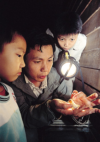 許瑞明帶著兩個兒子觀察雞母蟲。