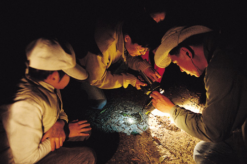 或者到林子裡撿一片葉形最美的樹葉吧!將樹葉夾在棉布裡不斷搥打,讓樹汁滲入棉布,搥印出天然色美麗的葉形來,就是一條擁有草香的手帕了。或者跟著許瑞明進入山林,尋找動物的腳印,再以石膏將動物朋友們的足跡拓印回家;還可以藉著簡單的滑輪繩索,將自己拉上2、3公尺高的樹冠層,觀察樹上的鳥類和蜜蜂、螞蟻是怎樣躲藏、覓食的。