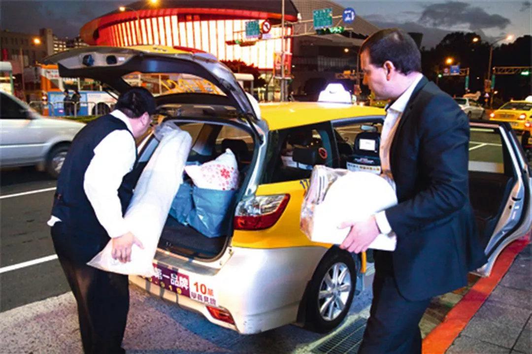 台灣的計程車已成功從交通運輸業轉型為服務業。圖為小黃運將主動協助購物乘客搬運物品上下車。