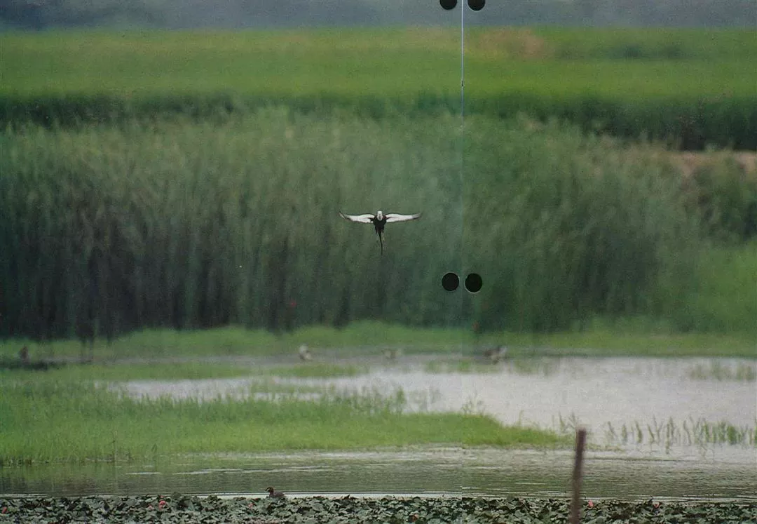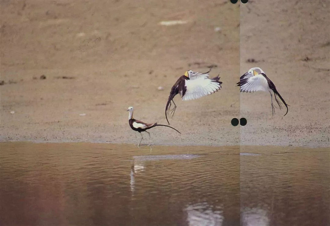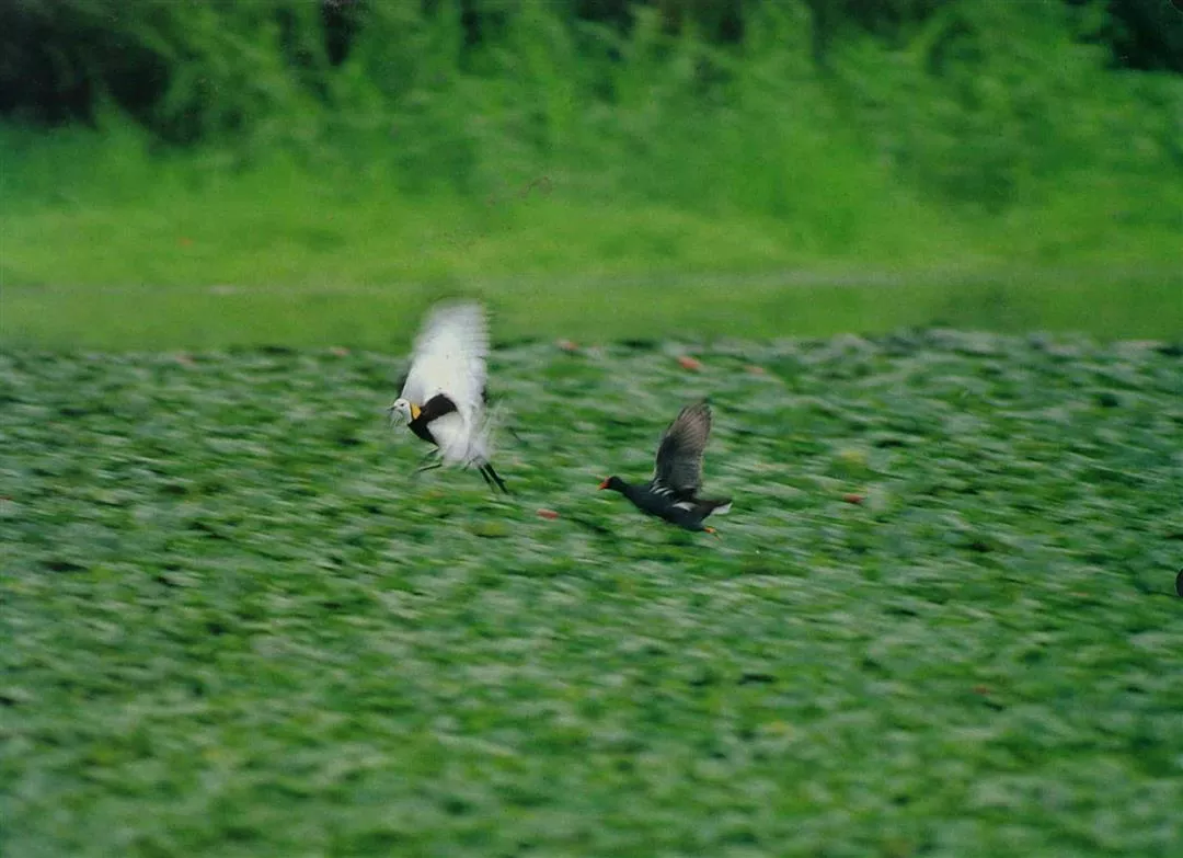 功夫比賽開始,雙方抱拳示意?振翅空中的兩隻水雉,左乃大腳娘子,意圖趕走破壞兩人小天地的公鳥。至於家裡的那口子「大丈夫」,只有一旁納涼,看老娘發威的份。說穿了,水雉是「女主外,男主內」,公鳥忙著翻蛋,免得南台灣的盛陽曬壞寶寶。