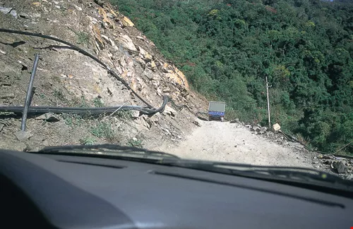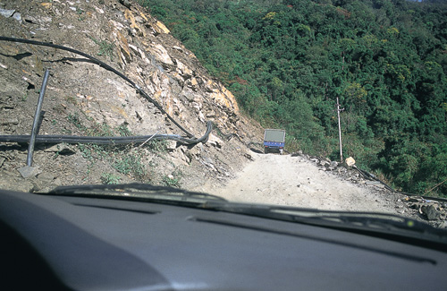 即使不是雨季,地形脆弱的力行產業道路仍是步步驚魂。從駕駛座望出去,無論是右邊坍塌的絕崖,還是左邊的崩坡,出入瑞岩之艱辛一望而知。
