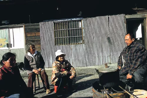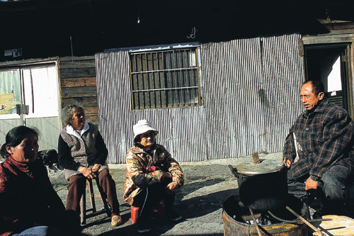 人際關係的重建是遷村的重要議題。遷住戶抽籤決定新家的位置後,還可以彼此互換,讓左鄰右舍可以住在一起。圖為居民在舊部落家門前聊天。