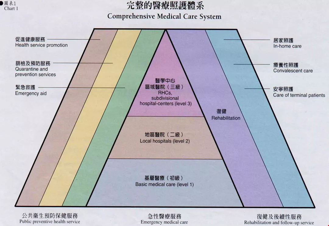 在急性醫療照護方面,一方面要求縮短城鄉間的醫療差距;另一方面,則要建立「分級醫療」制度,包括照顧面最廣的基層醫療、第二級的地區醫療,以及第三級以複雜高科技為主的醫學中心和區域醫院等,達到所謂的「小病看小醫院,大病看大醫院」。在這個體系之外,先期的預防保健體系和後續的復健、慢性病照護等等,也都同等重要;鼎足而三,才能負起全民醫療保健的重擔。(圖表一)