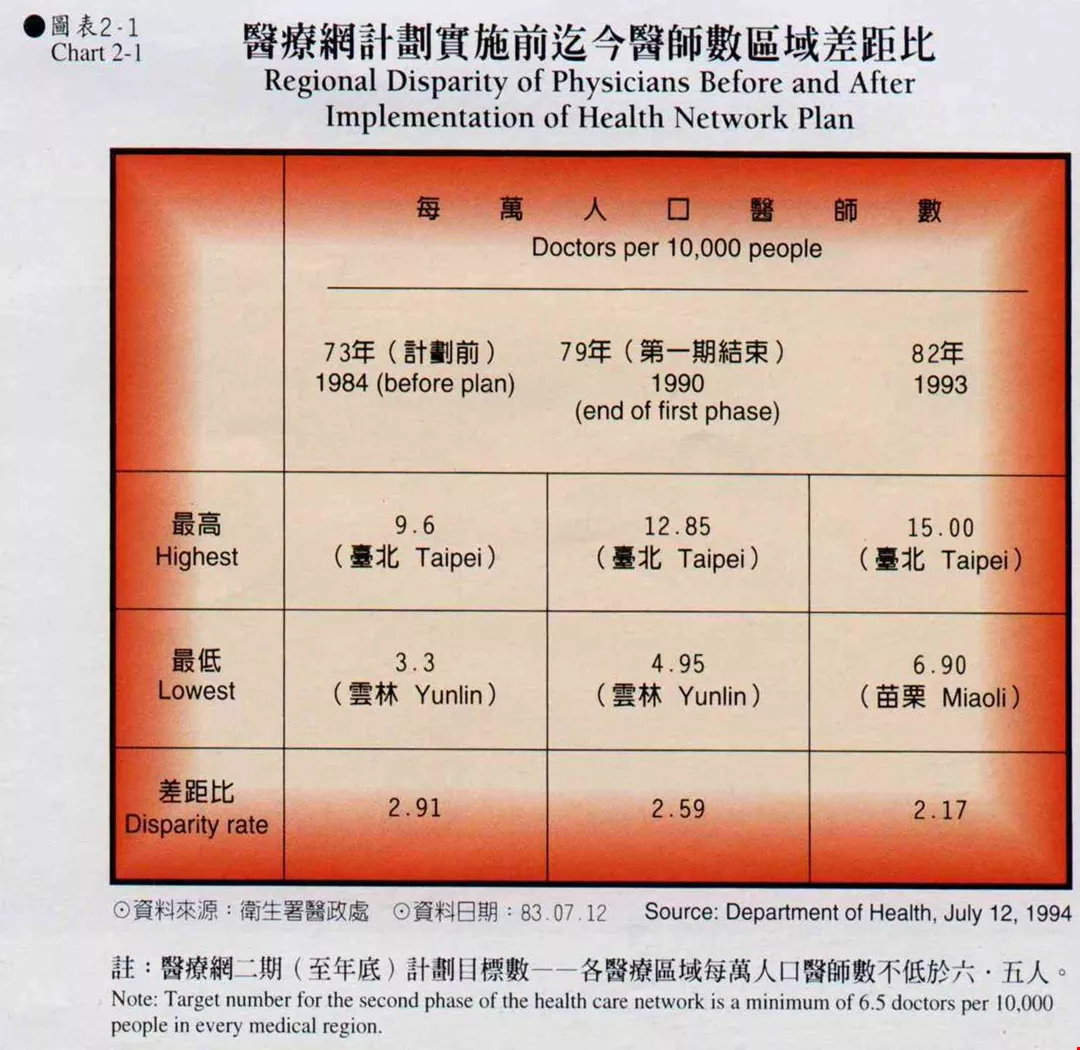譬如以每萬人口醫師數來說,目前最高的台北區(每萬人中有十五位醫師)和最低的苗栗區(每萬人中有六.九位醫師),差距比是二.一七,比計畫前的最高(台北區)和最低(雲林區)的差距比二.九一,已經拉近不少。(圖表二)