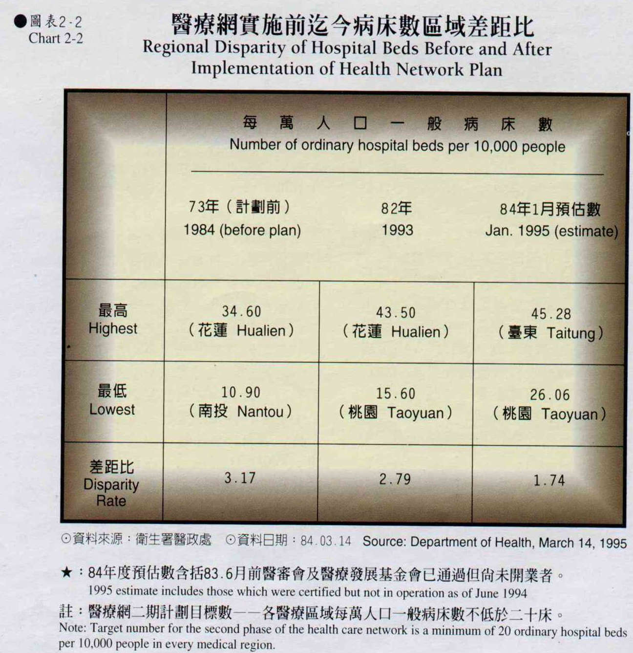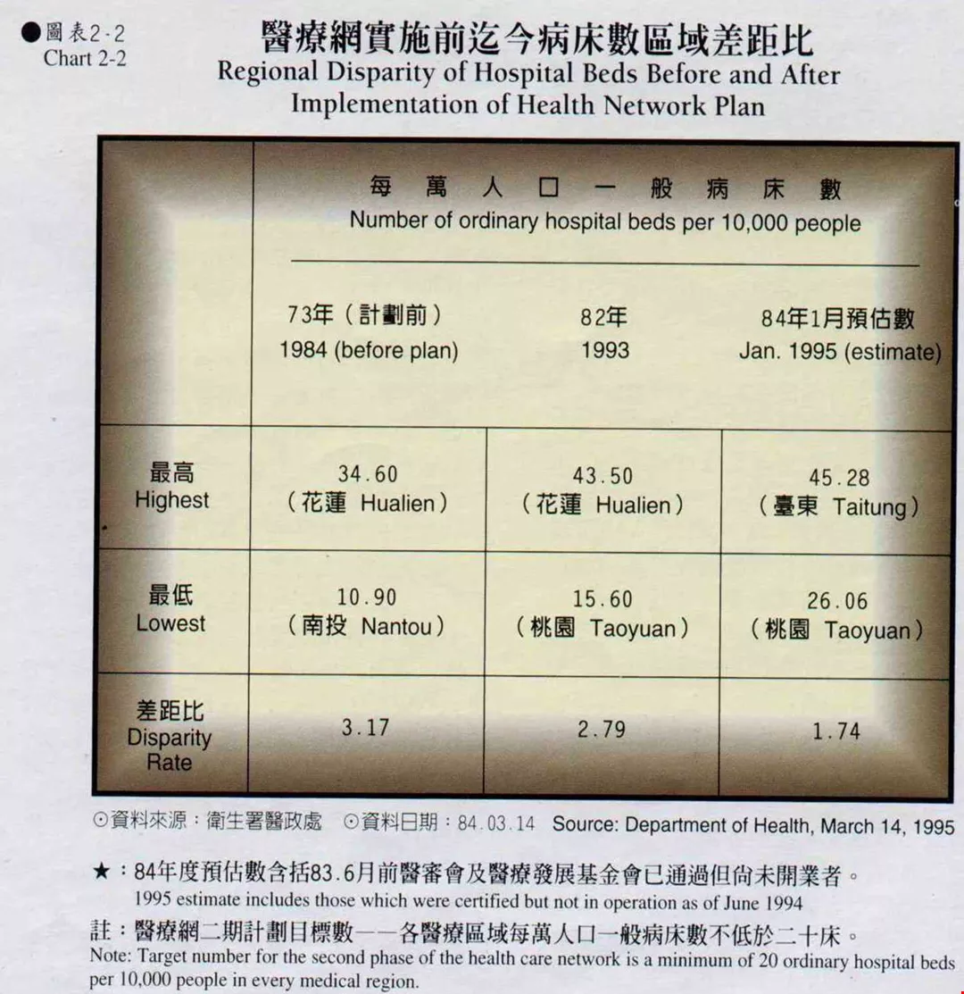 就城鄉醫療資源的平均分佈來說,目前績效令人驕傲。在全國依生活圈概念劃分的六十三個醫療次區域中,只有九個地區仍屬「醫療資源缺乏區」,大部分是偏遠的山地或離島。這個數字,比起計畫實施前的卅七個,已經改善許多;同時各醫療區域間的高低差距比,也已在逐漸縮小中。