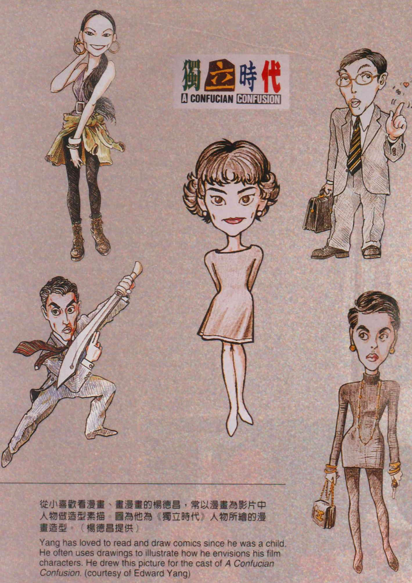 從小喜歡看漫畫、畫漫畫的楊德昌,常以漫畫為影片中人物做造型素描。圖為他為《獨立時代》人物所繪的漫畫造型。(楊德昌提供)