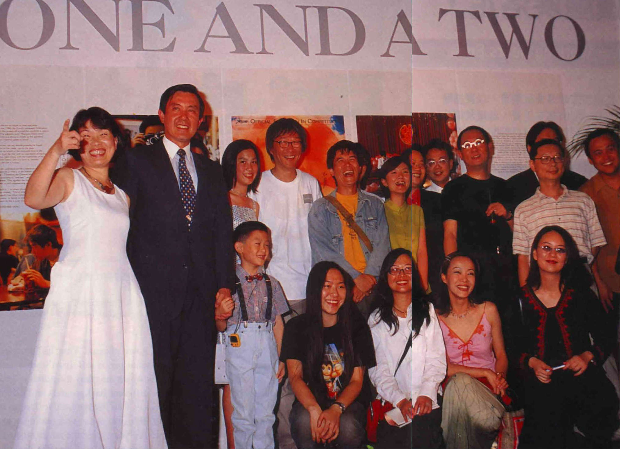 楊德昌自法國坎城回國後,台北市政府為他舉辦慶功晚會,他一一邀請《一一》的演員、工作人員上台,接受大家祝賀。左起為文化局長龍應台、台北市長馬英九和女主角李凱利等人。(薛繼光攝)