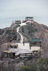 國軍防禦工事遍布馬祖各個角落,幾乎和民間廟宇一樣處處可見,往往前一處景點才讓遊客為過去國軍辛苦開鑿的各種「不可能的任務」肅然起敬,沒幾步路,媽祖端坐香煙繚繞的廟中,正微笑等你歇腳。
