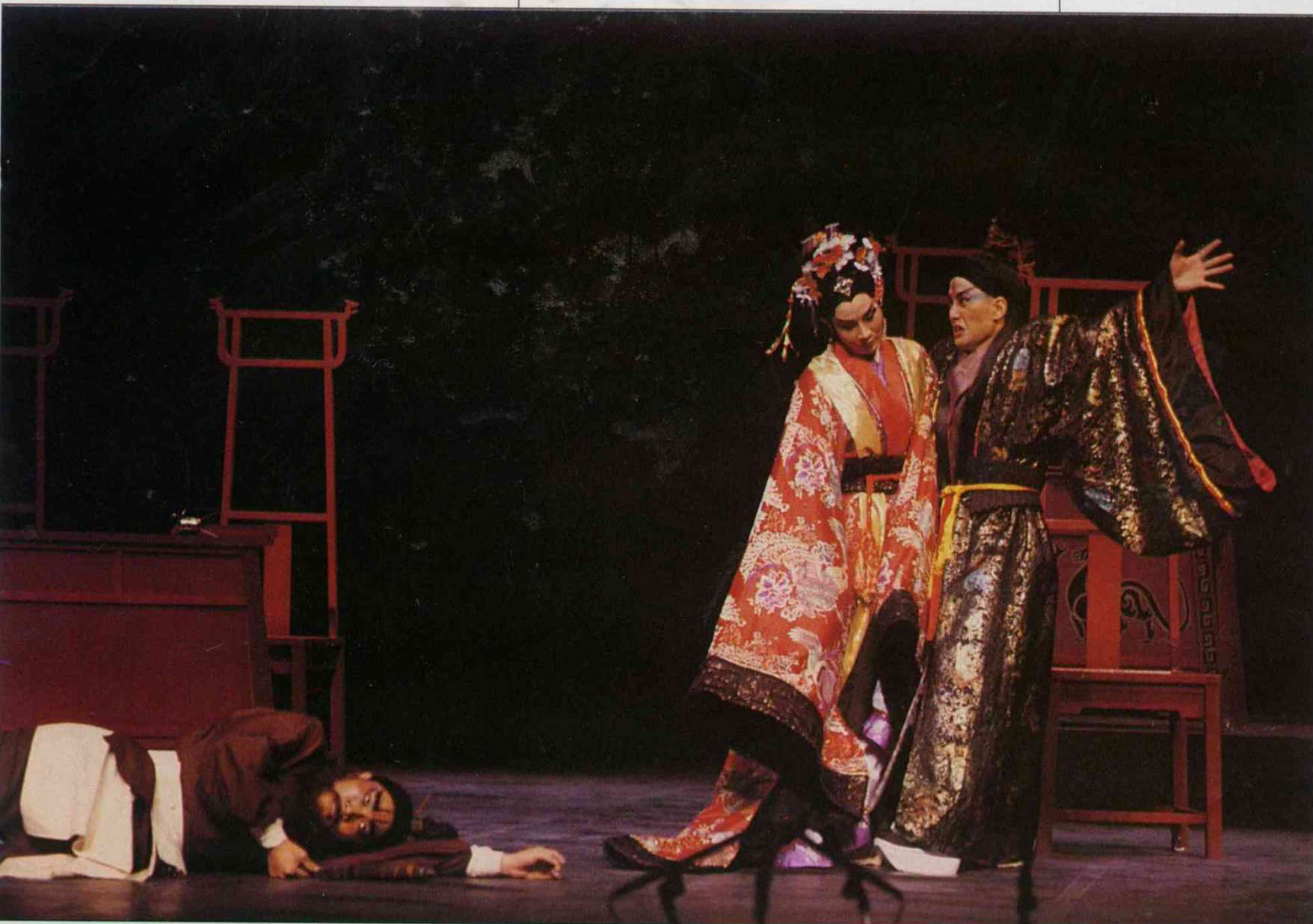 但是且慢——濃豔的中國色彩和喧譁的京戲節奏,能否恰如其份地傳達沉重黑暗的悲劇感?兩個半小時的戲,勻一半給了國劇的唱作唸打,還能不能清楚交代劇情?唱辭唸白要如何貼切翻譯又不失原來韻味?文化背景的差異又要如何消解?種種問題都使人懷疑莎劇與國劇交融的可能性。