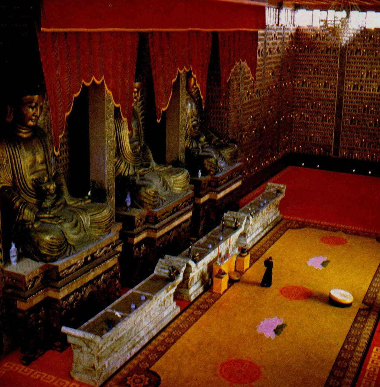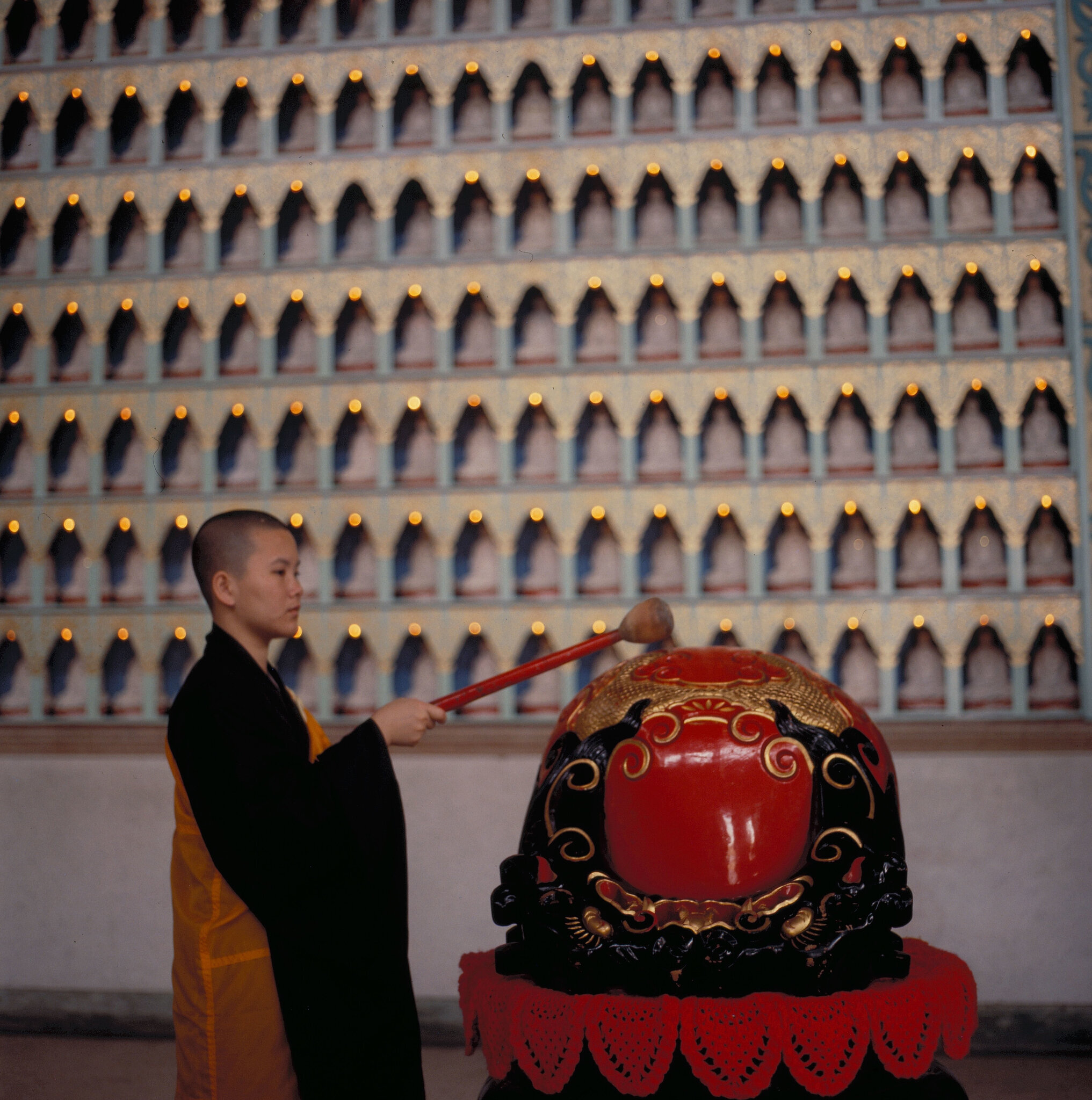 大殿的四面牆壁中,有一萬四千六百個小洞,每個洞中供奉一尊小佛像,洞的上方分別裝上小燈,下方則寫著認捐信徙的名字,稱為「光明燈」。當夜幕低垂,燈光齊亮,四面牆壁金光點點,有說不出的神聖莊嚴。
