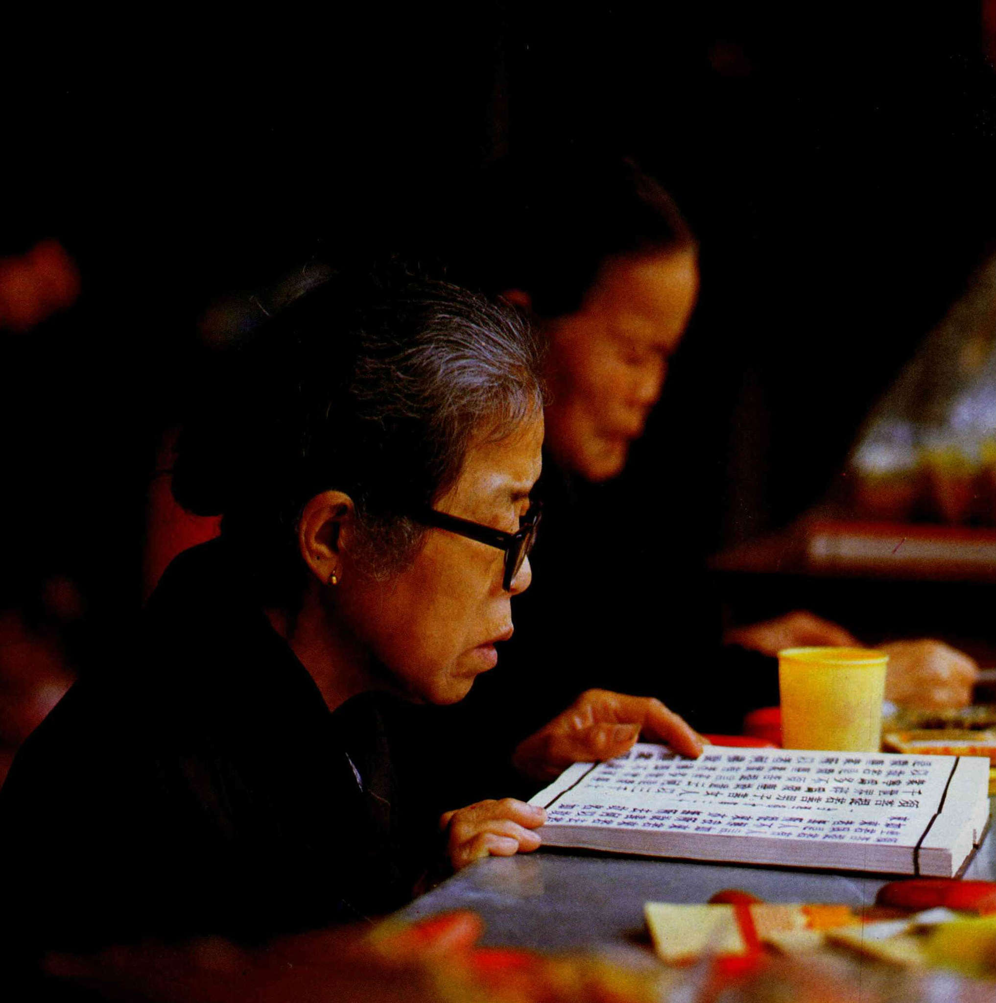 晨鐘敲響之後,早課隨即開始,出家信徒專注的誦經念佛。