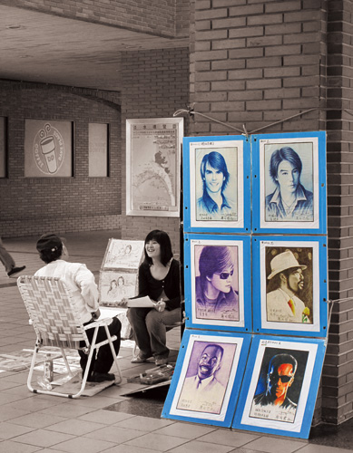 肖像生涯 文‧紀國章 圖‧紀國章 2009 8月 EN 分享: 台北縣•淡水捷運站 坐定之後,開始端詳,然後提筆測量比例、找出特徵、掌握眼神。 下筆之後,控制水分與墨彩、運用技巧,最後再細部潤飾,於是大功告成。 「哇!好像喔!」是的,客人展露的滿意笑顏,才是我最溫暖的酬勞! 分享: