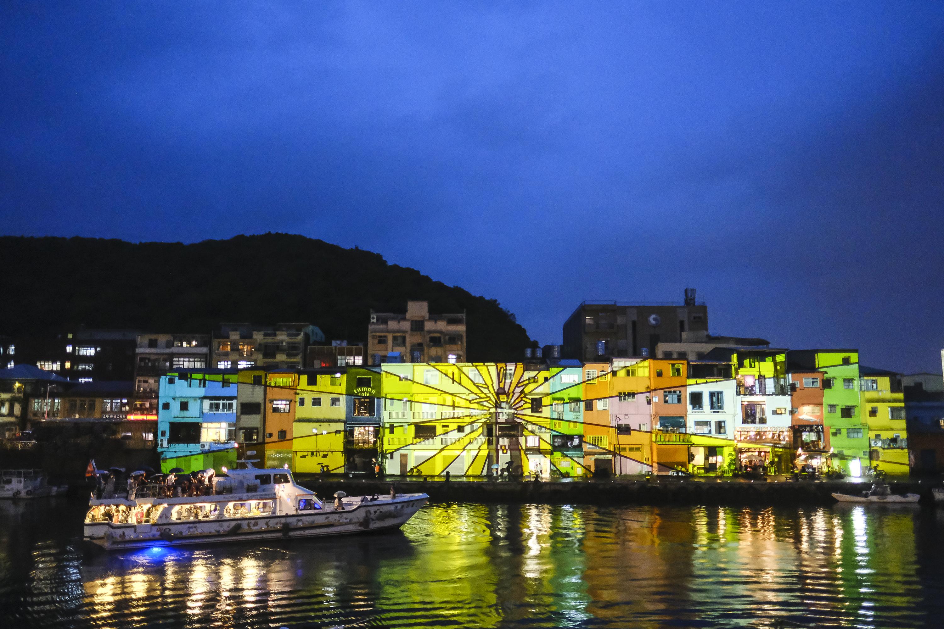 基隆市的2022城市博覽會熱鬧登場,把城市當作展場。正濱漁港搭配音樂並且用光雕妝點牆面,吸引了許多遊客搭船近距離欣賞。
