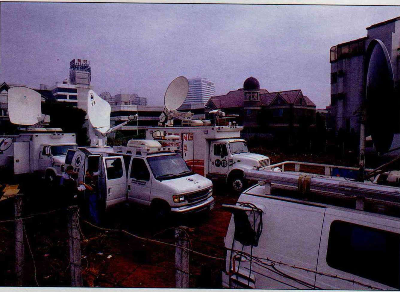 電視台衛星轉播車在林口白冰冰家來來去去,追蹤現場、鉅細靡遺、挖掘獨家,到底媒體的責任、義務、道德之間有沒有平衡點?(薛繼光攝)(薛繼光攝)