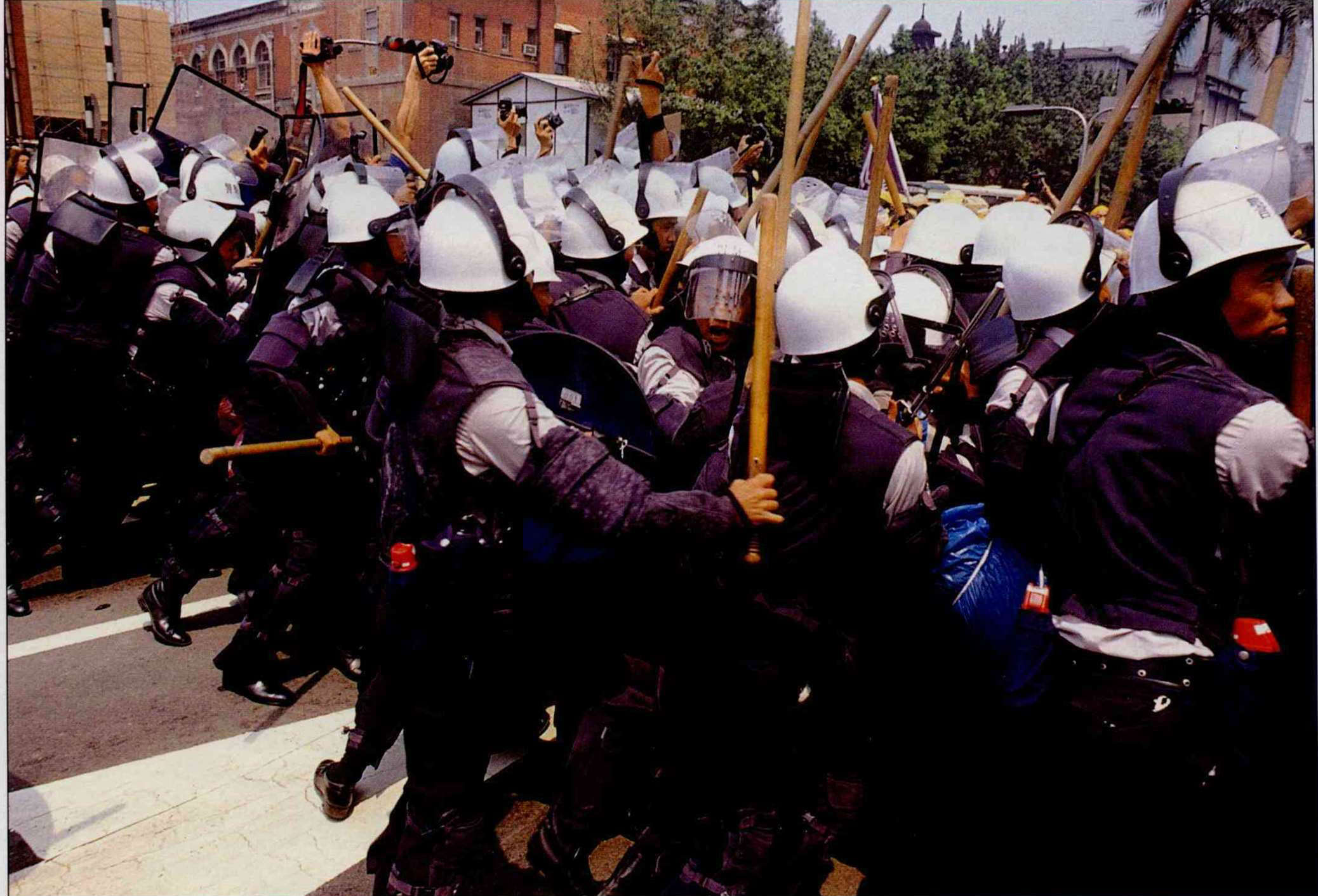遊行抗議,攝影記者奮不顧身搶拍畫面,成為遊行人群和警方中間的「夾心餅乾」。(卜華志)