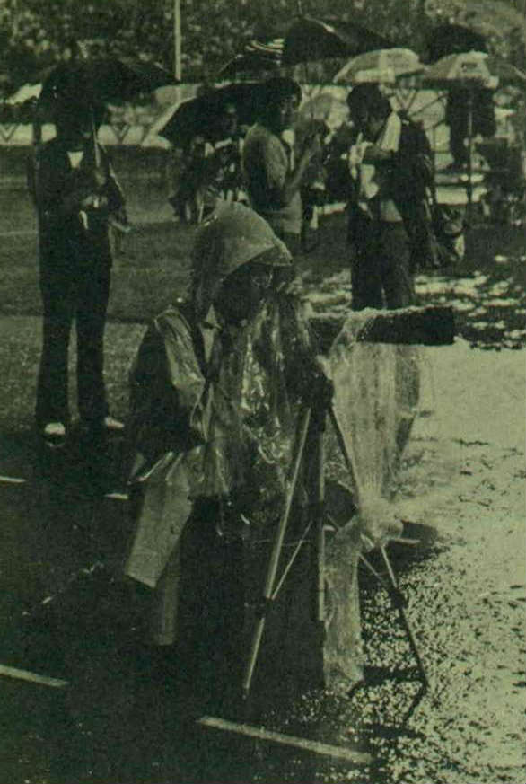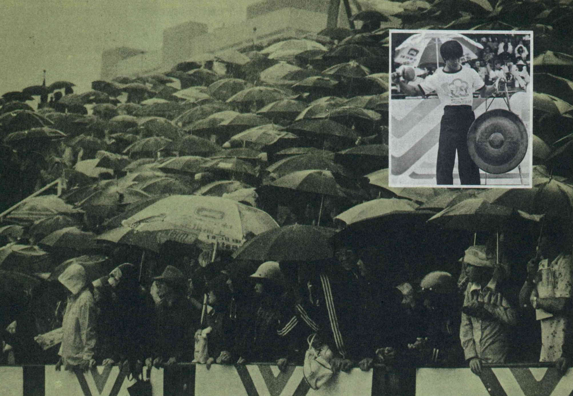儘管艾克颱風肆虐,將近一萬的田徑迷,當天仍冒著風雨,趕到台北市立體育場觀賞國際田徑邀請賽,從下午三時,就一直撐著傘,站在看台上,看到比賽結束,全然不管風雨的騷擾,也忘了轆轆饑腸。