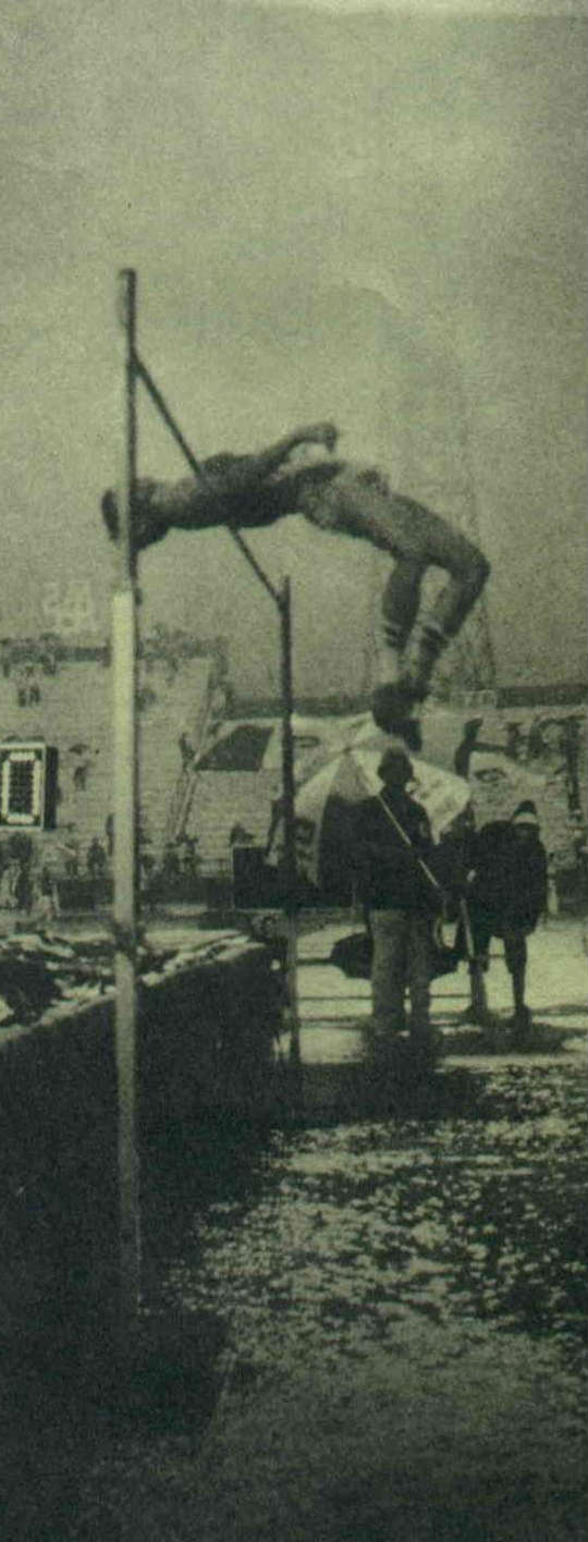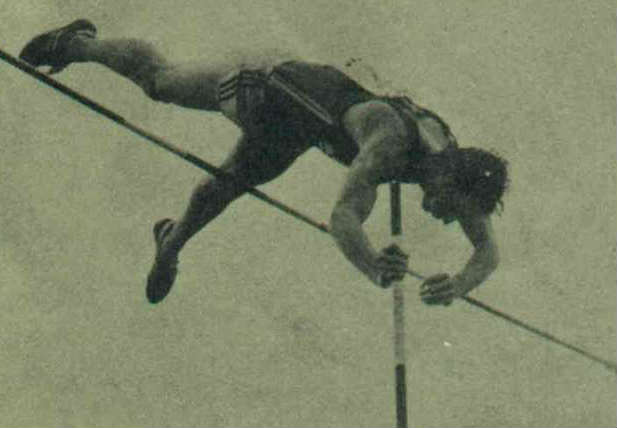 男子撐竿跳高選手,加拿大的柯里瓦斯,賽前用他自己一百六十磅的玻璃纖維竿練習時,不小心把竿子弄斷了。大家都知道撐竿跳是具有危險性的運動項目,尤其遇到雨天,竿子淋濕了之後很滑,更容易發生意外。在這種情況下,柯里瓦斯大有理由不出場,然而他卻沒有這麼做,仍舊冒雨借用別人的竿子比賽。