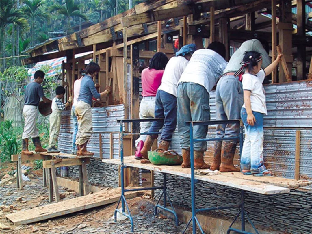 「工作隊員只要學會使用扳手,將鑽孔處的接點以螺絲栓緊,房子主結構就可以像樂高積木一樣架起來,對原本就習於在都市工地做模板、綁鋼筋的原住民來說,完全不是問題,」謝英俊說。他更號召無業青年、酗酒的族人加入,連小孩都來鎖螺絲、婦女砌竹牆,大家都幫得上忙。