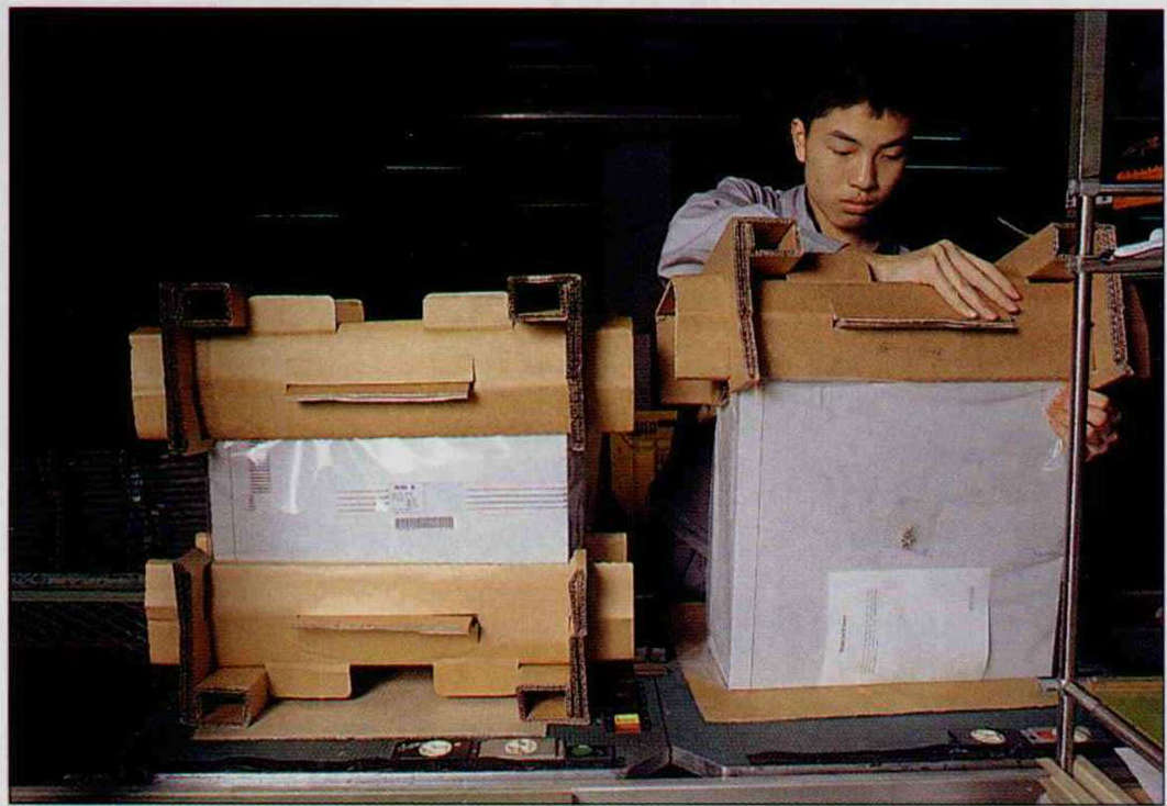 用經過特殊折疊的再生瓦楞紙來取代保利龍緩衝材,既符合環保,又因體積及重量減少而節省運費。(張良綱)