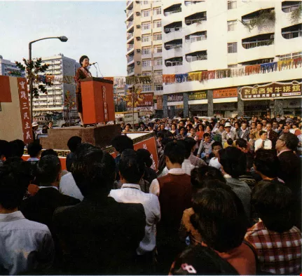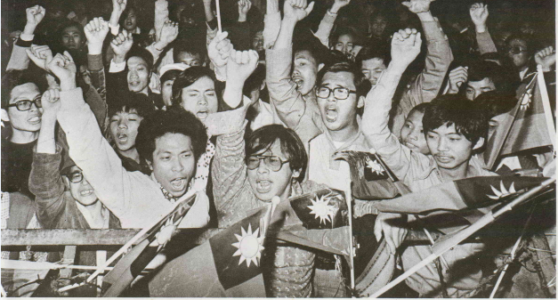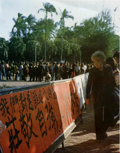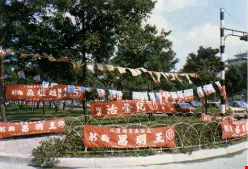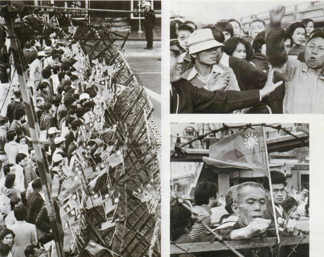 還有些候選人,把宣傳車上貼滿了義正辭嚴的標語,立刻變成了愛國花車!花車集結成車隊,競選事務所的人都舉著國旗,跟在車隊後面,遊行到總統府前,同聲高呼「支持政府,反共到底」;並呼籲全國同胞,化忿怒為力量,愈患難要愈堅強。