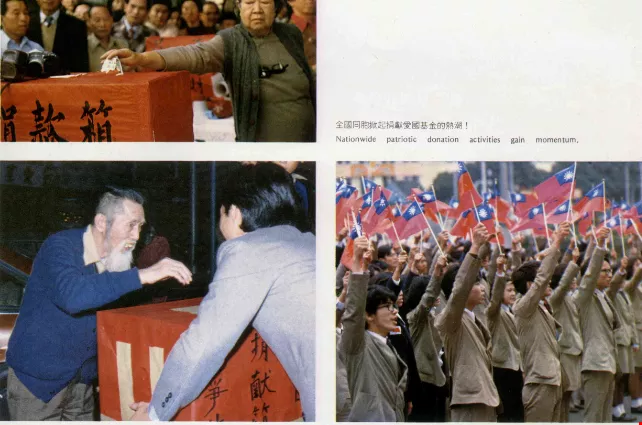 「愛國捐款」的運動在不同的角落、不同的階層展開。台灣大學和淡江文理學院的學生們發起「國防捐獻救國運動」,無論是工人、商人、學生、公務人員、家庭主婦、小販或計程車司機,都從四處趕往捐獻。有小朋友抱著撲滿去當場打開投進箱中,有主婦把菜錢捐了出來…………。