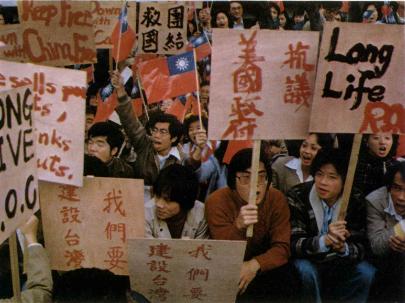 當天下午,數以千計的愛國民眾,陸續湧向台北市忠孝西路二段的美國大使館,他們在門前呼口號、貼標語,抗議美國政府背信毀約的行為。
