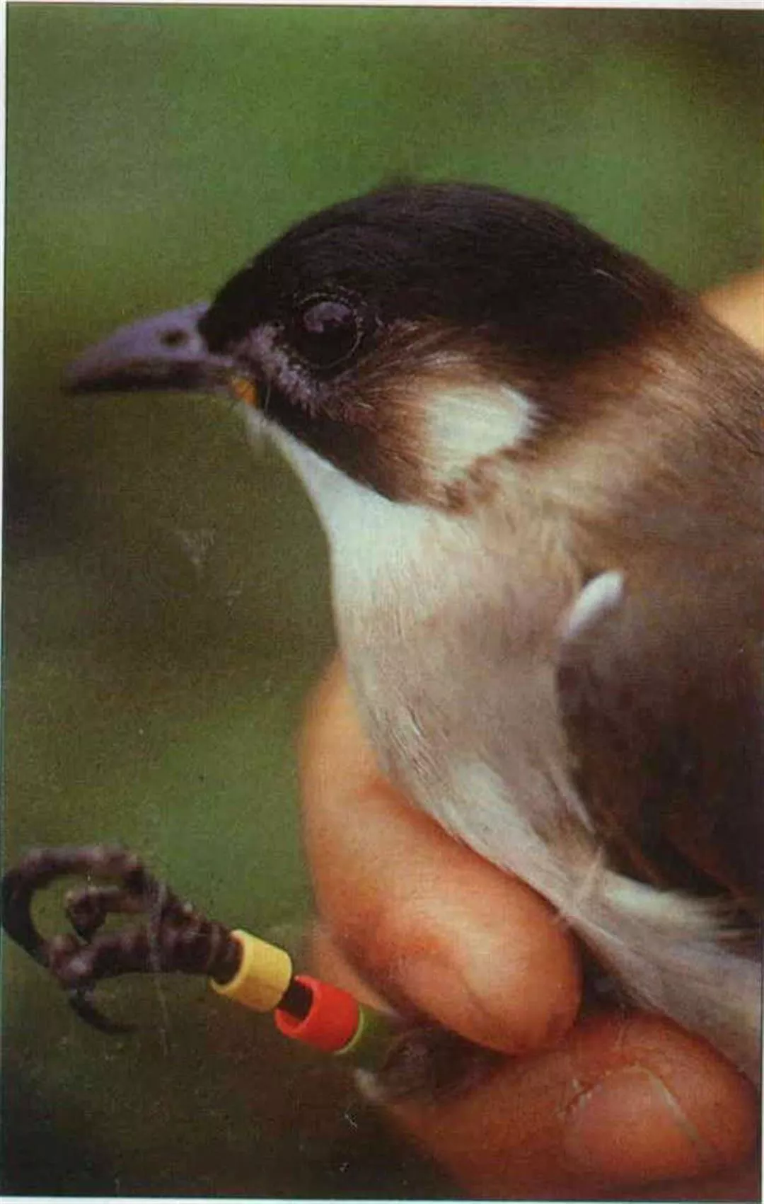 中研院動物所研究人員給同時具有烏、白頭翁特徵的「雜」頭翁上腳環,以便追蹤觀察。圖中鳥兒雖有黑冠,臉部特徵卻和白頭翁一樣。(中研院動物所提供)