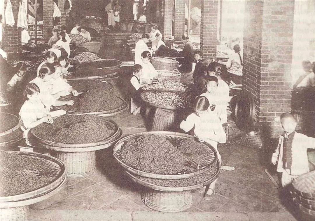 清末英國人引進烏龍茶,為台北帶來商機。當時的貴德街因茶而貴,華人與洋人開的烏龍茶莊、包種茶行櫛比鱗次,儼然「國際商業中心」,圖為茶莊大市時婦女們忙於揀茶。