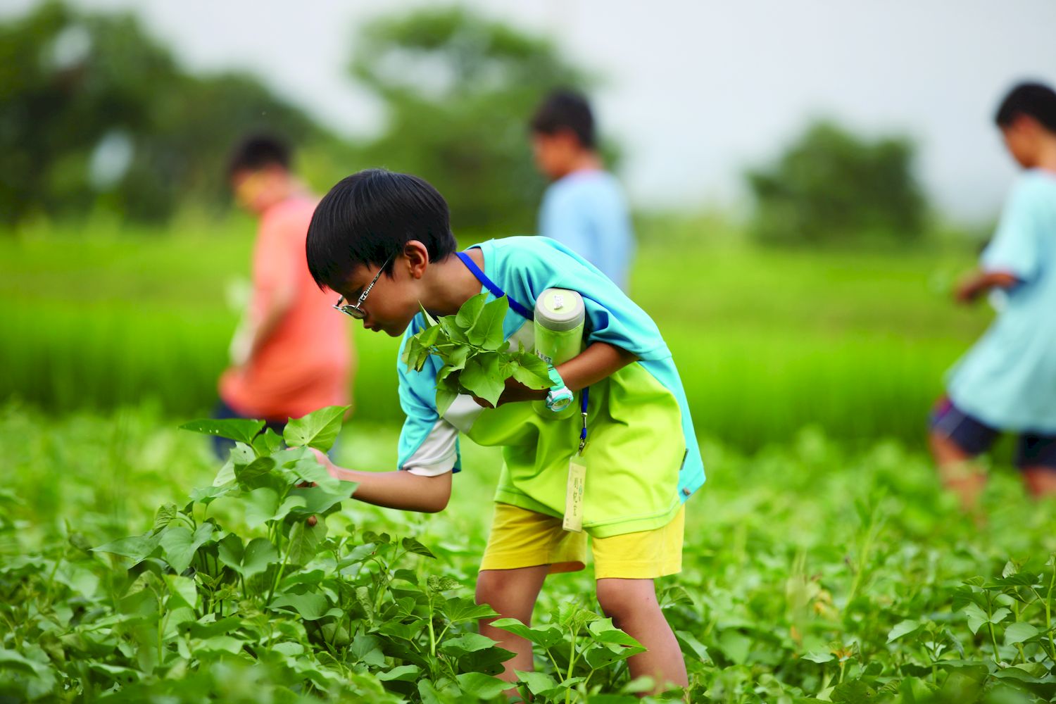耕讀農場裡,孩子親手栽種 向日葵、採摘地瓜葉,體會 汗滴禾下土的成就和艱辛。 (福智文教基金會提供)