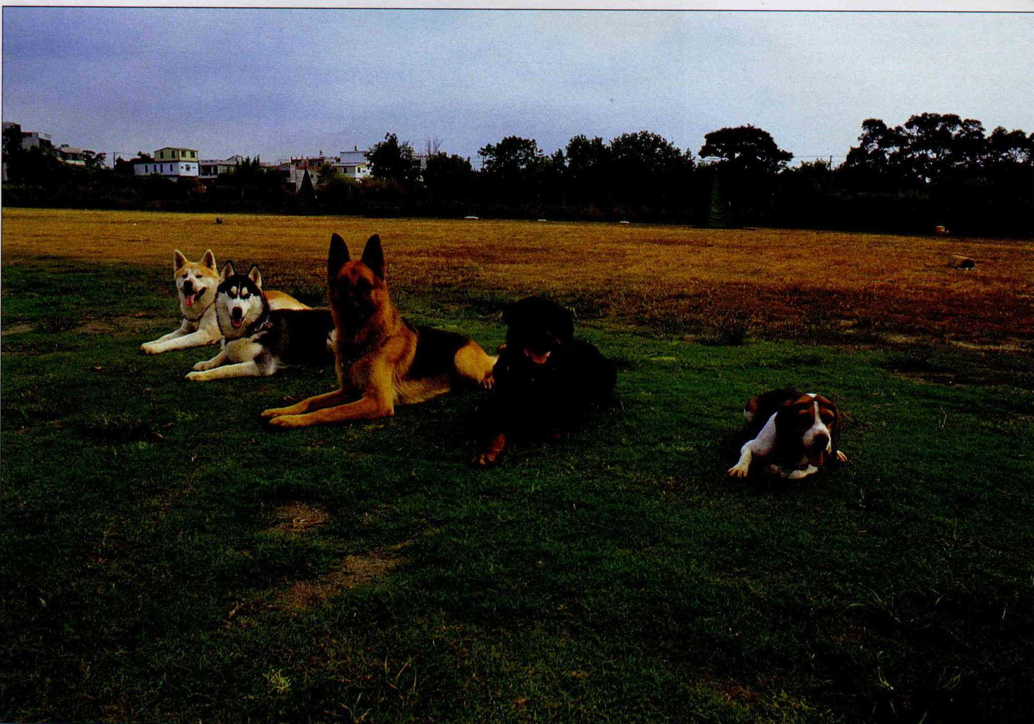 它們並排臥,在等什麼?受過嚴格訓練的狗,在主人下達「臥倒」的命令後,靜臥等待,不敢造次。(劉偉群)
