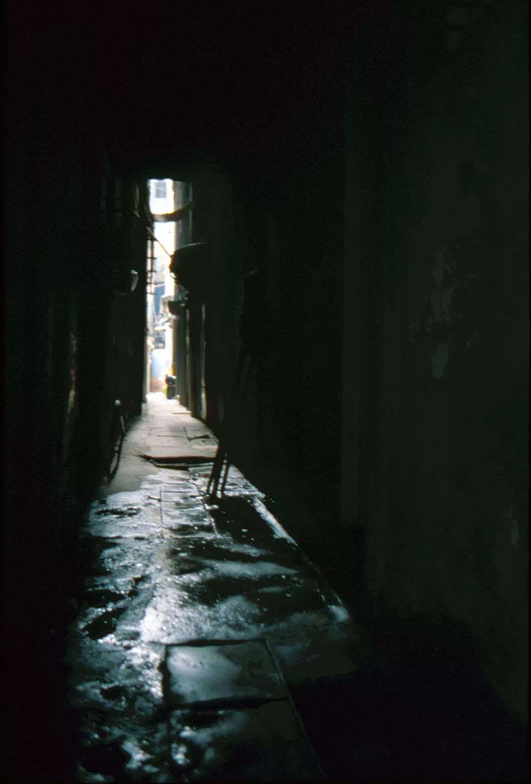繁華市區中,髒亂積水仍處處可見。圖為兩棟大樓間的防火巷。