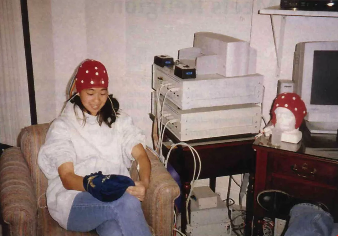 定居海外、從七年前就加入李嗣涔「手指識字」實驗行列的高橋舞,每次回台灣,除了忙著做實驗,還得替聞風而來的親友算命。圖為高橋舞頭戴量測電磁波的貼片,進行「手指識字」實驗。(李嗣涔提供)(李嗣涔提供)