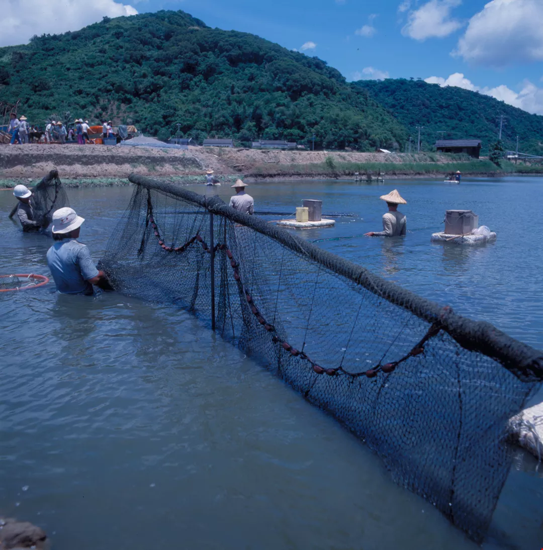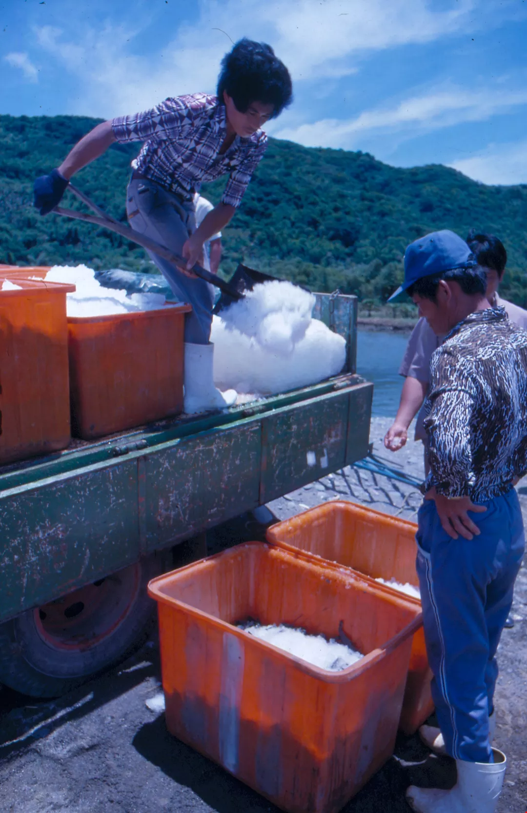 圖1.3:草蝦養殖是滿州鄉新興行業之一,工人網蝦後,直接裝箱、加冰保鮮,運往屏東市銷售。(艾瑟)