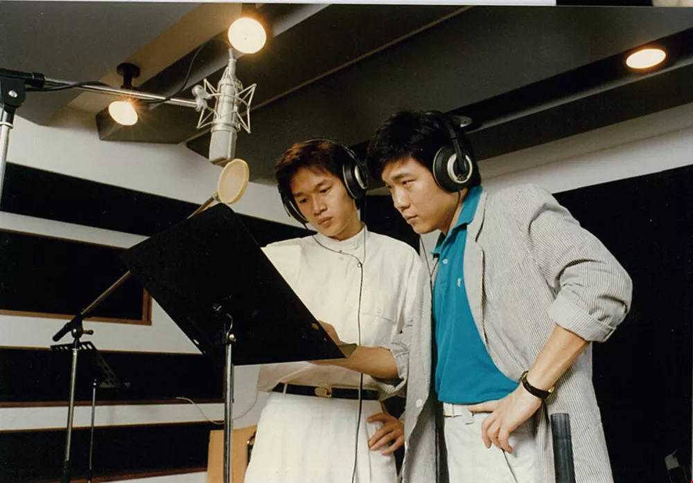 上揚唱片不僅推廣優質的台灣藝術音樂,同時也發掘了如第一屆金曲獎最佳男歌手殷正洋等主流歌手。圖為製作人梁弘志(右)與殷正洋合影。(上揚唱片提供)