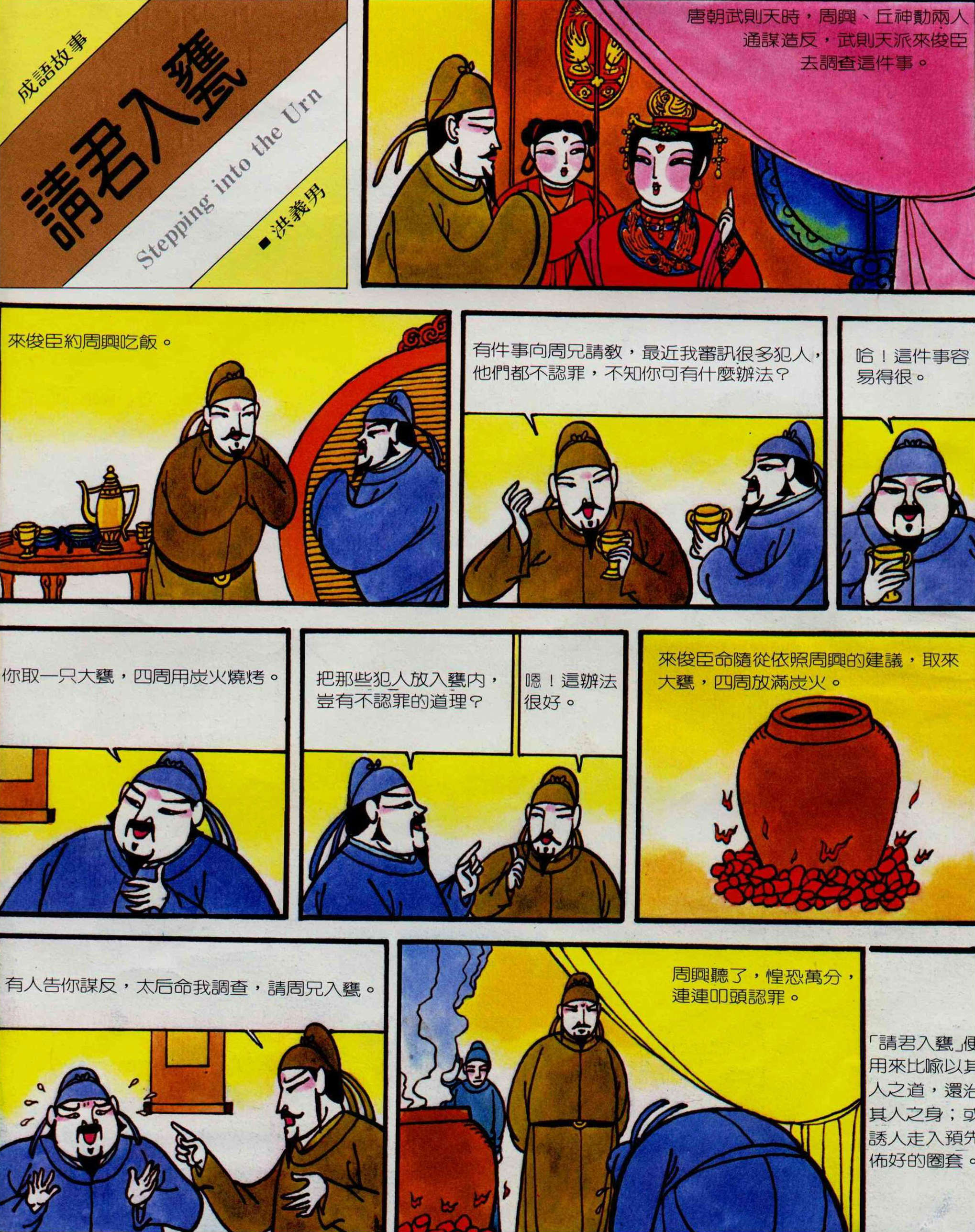 請君入甕 文‧圖.洪義男 圖‧洪義男 1985 1月 EN 分享: 唐朝武則天時,周興、丘神績兩人通謀造反,武則天派來俊臣去調查這件事。 來俊臣約周興吃飯。 有件事向周兄請教,最近我審訊很多犯人,他們都不認罪,不知你可有什麼辦法? 哈!這件事容易得很。 你取一隻大甕,四周用炭火燒烤。 把那些犯人放入甕內,豈有不認罪的道理? 嗯!這辦法很好。 來俊臣命隨從依照周興的建議,取來大甕,四周放滿炭火。 有人告你謀反,太后命我調查,請周兄入甕。 周興聽了,惶恐萬分,連連叩頭認罪。 「請君入甕」便用來比喻以其人之道,還治其人之身;或誘人走入預先布好的圈套。 分享:
