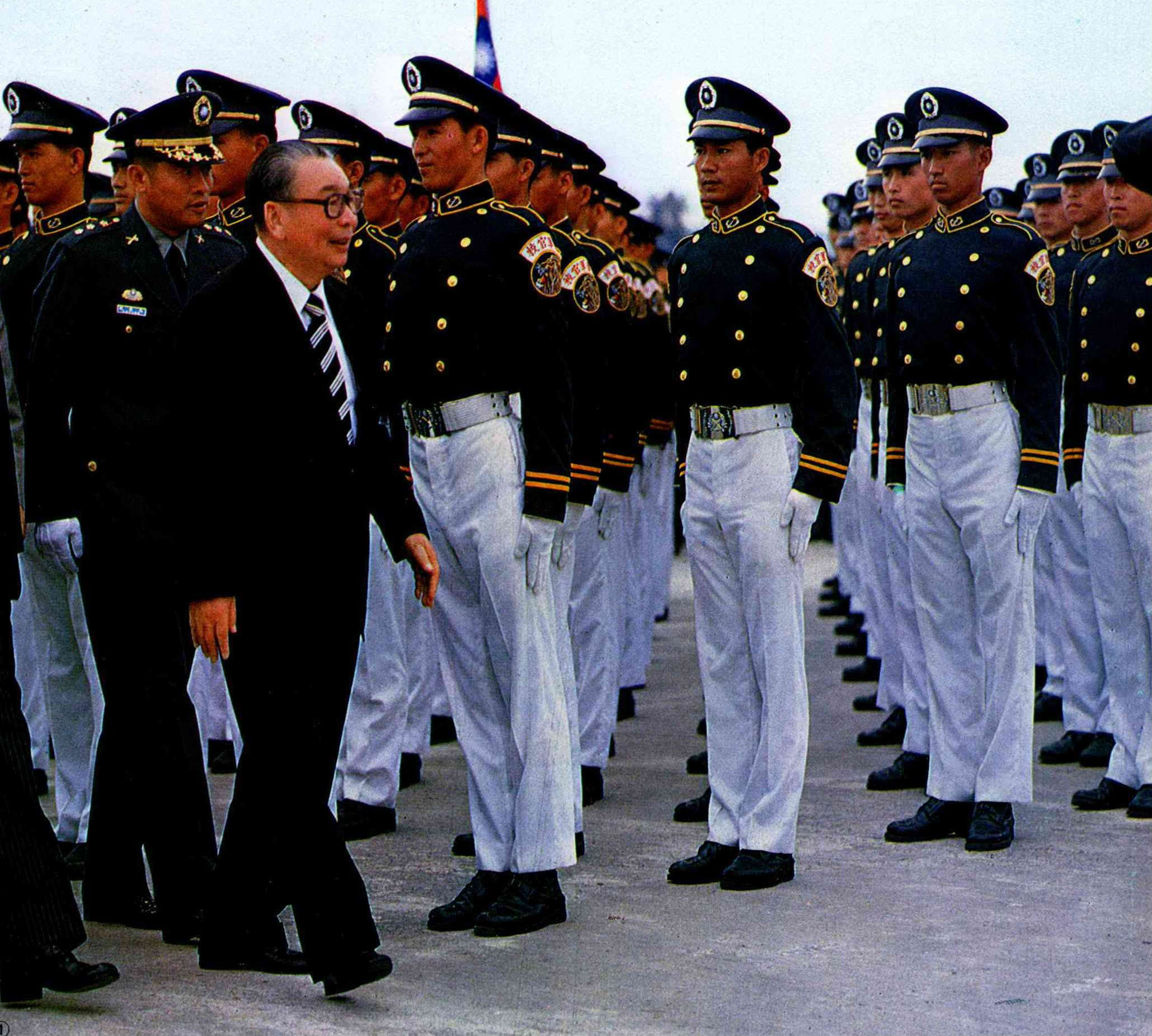 圖1.2.3:蔣總統經國先生對陸官學生極為關愛,曾多次蒞校主持校慶典禮,圖為他校閱學生隊伍及參加校慶餐會的情景。(楊永山/高稚偉/黃埔出版社)