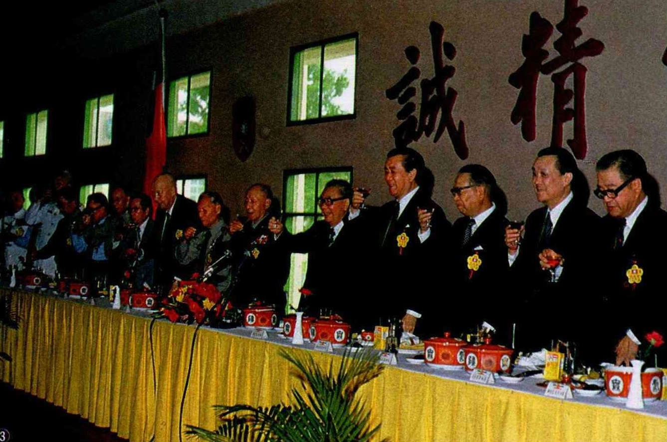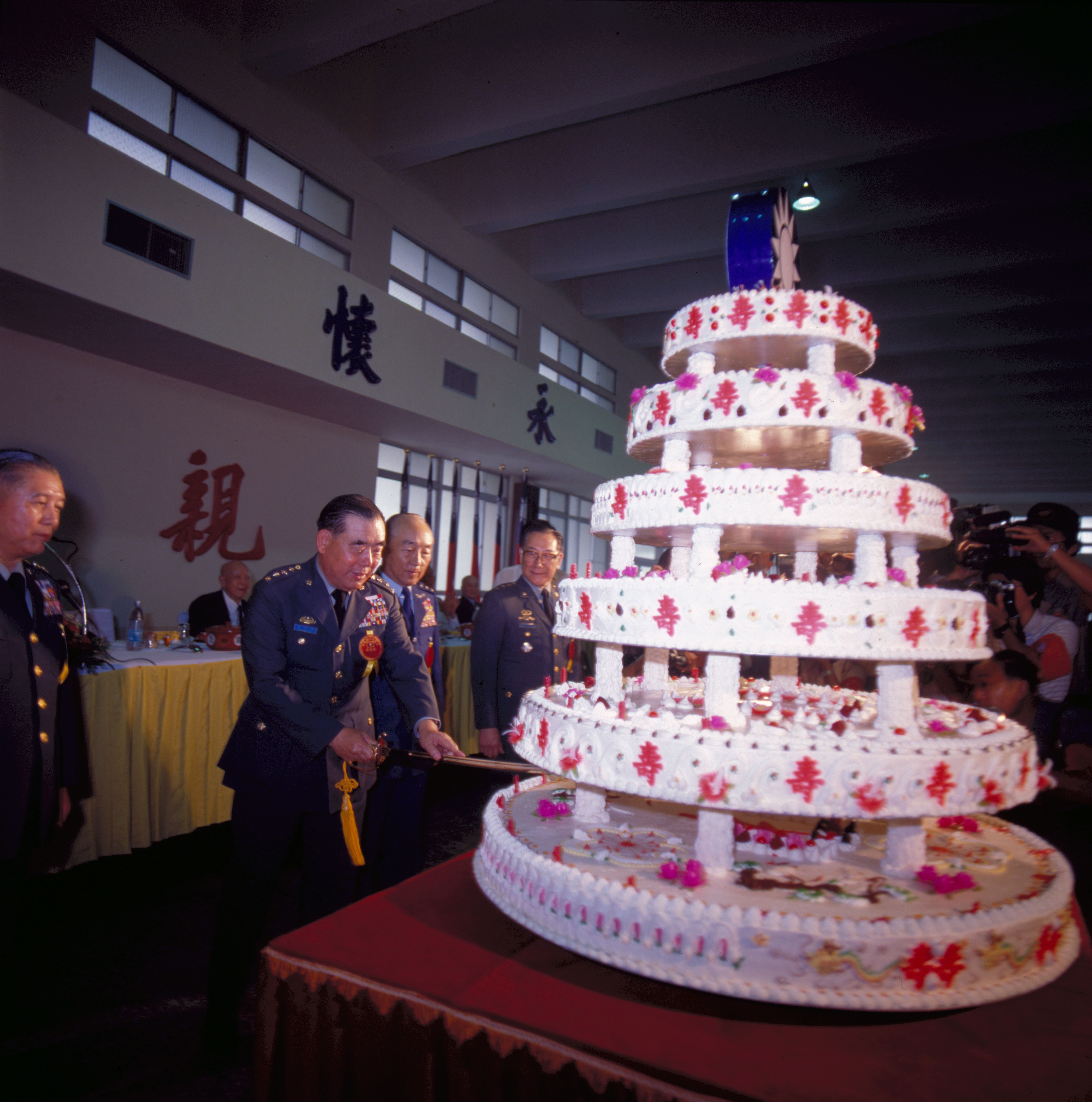 圖4:今年的校慶由參謀總長郝柏村主持,他在餐會上切開象徵陸官過六十歲生日的六層大蛋糕。(楊永山/高稚偉/黃埔出版社)