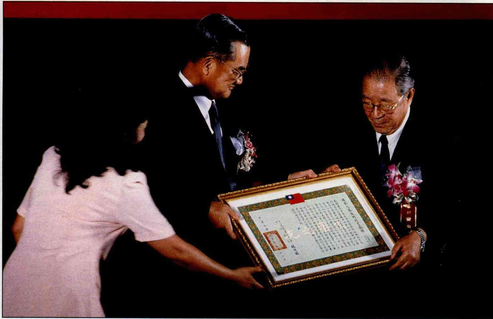 副總統兼行政院長連戰頒發國家文藝特別貢獻獎給劉紹唐。薄薄一紙獎狀,代表國家的肯定和社會的公評,也是劉紹唐和傳記所有的編者、作者與讀者共同賺來的。(卜華志)