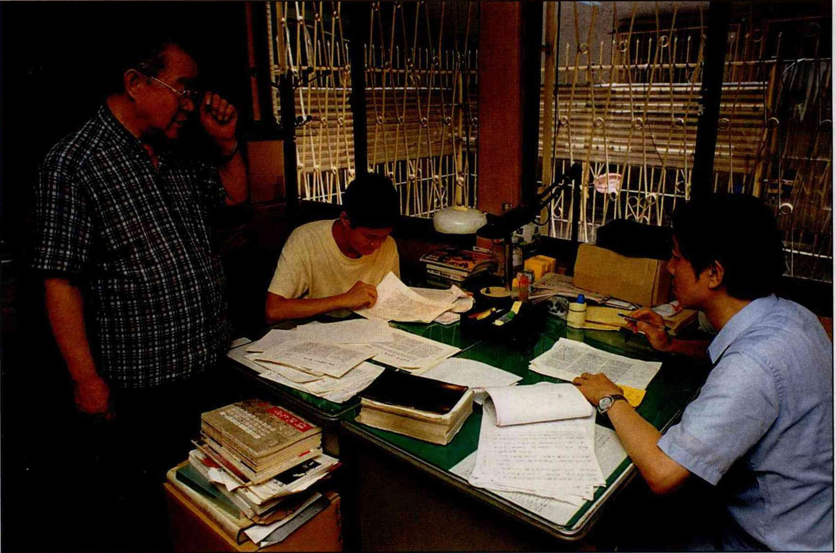 在「傳記文學」三十年如一日的辦公室中,劉紹唐不時得和資深編輯邱慶輝(左)、編輯並「民國人物小傳」作者於翔麟討論進度和資料搜證等細節。(卜華志)