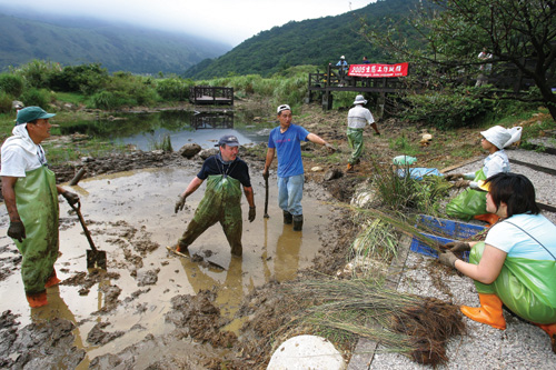 社團法人台灣環境資訊協會與台灣拜耳公司合辦的「2005生態工作假期」,在陽明山的雍來廢礦場進行濕地復育和水、陸生植物的栽種工作,是NPO和PO合作的案例之一。
