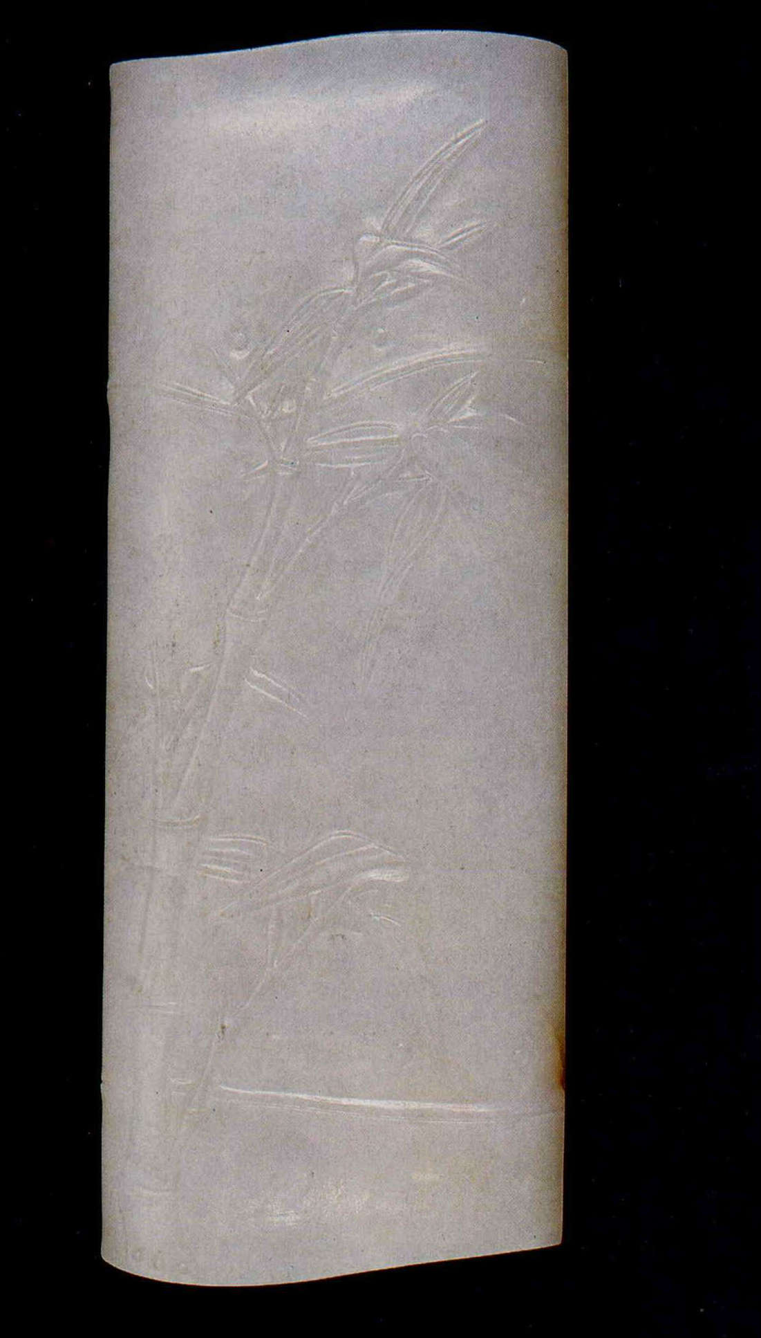 這件白玉臂擱不但模仿縱剖竹子的形狀,上面還淺雕著竹畫,而竹子象徵著君子的節操,正和比做君子仁、義、智、勇、潔五項美德的玉,相得益彰。