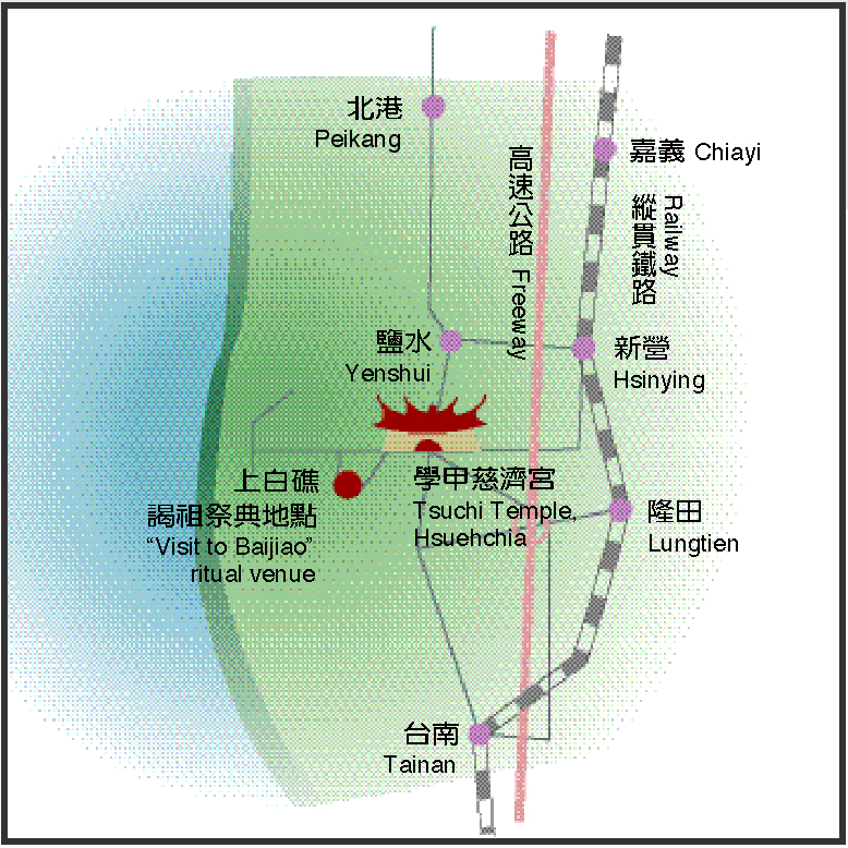 廟方祭典過後,於藝陣的簇擁下,將宮內保生大帝延請出宮、上了神轎後,一行長達三、四公里的隊伍,便開始出發,準備到四公里外的白礁亭去追思祭祖了。