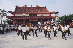 (右)為迎接遙拜儀式,上白礁亭前,「宋江陣」首先登場,以其威武嚴整的武術力道為祭典開啟序幕。