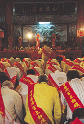 「上白礁」祭典既拜神也拜祖先,三跪九叩,一切行禮如儀,表現出血濃於水,不敢忘本的精神。